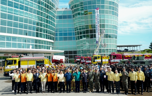 이와 함께 제주국제컨벤션센터 내 화재 발생에 따른 진압과 탐지견·수소드론을 활용한 화재건물 내부 인명 탐색, 119소방 진압대원과 구조대원의 건물 내부 인명구조, 닥터헬기를 활용한 병원 이송 등으로 훈련이 마무리됐다.