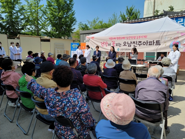 ‘건강이 꽃피는 오남진주아파트’는 매월 다른 주제로 야외에서 진행되는 건강 프로그램으로 5월에는 가정의 달을 맞아 치매안심센터 방문이 어려운 어르신들에게 치매 조기 검진 및 치매 예방 교육을 실시해 일상생활에서도 치매 예방을 위해 실천할 수 있는 건강 습관을 꾸준히 유지하도록 독려했다.