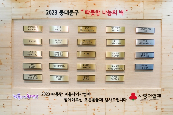 나눔 문화 확산과 고액 기탁자 예우 차원에서 올해 처음으로 설치된 ‘따뜻한 나눔의 벽’은 앞으로 매년 4월에 희망온돌 따뜻한겨울나기사업 결과에 따라 대상자를 관리할 예정이며 행사 시 포토존 등으로도 활용될 예정이다.