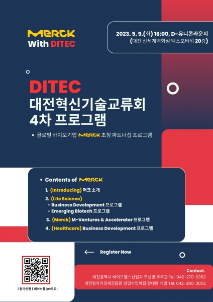 한선희 대전시 전략사업추진실장은 “이번 행사는 글로벌 시장 진출을 추진하고 있는 지역의 바이오기업들에게 큰 도움이 될 것”이라며“머크사와 협력관계를 구축해 세계 시장에 도전하는 지역 바이오기업의 많은 참여를 바란다”고 말했다.