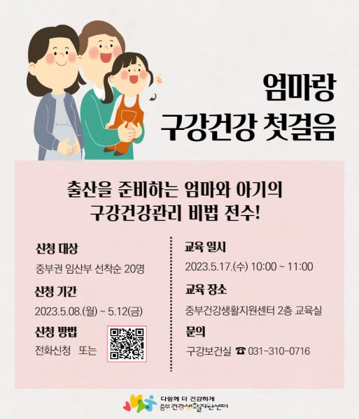 이는 임산부의 구강 관리 능력을 높이고 건강한 출산 지원을 위해 마련된 것으로 교육 참여를 희망하는 임산부는 5월 8일부터 12일까지, 네이버 폼 신청서를 작성하거나 중부건강생활지원센터 전화로 신청하면 된다.
