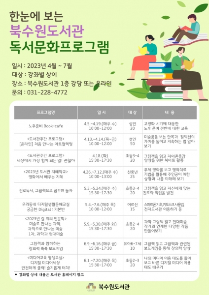 북수원도서관 홈페이지, 수원시도서관 모바일앱에서 프로그램에 대한 상세한 정보를 볼 수 있다.