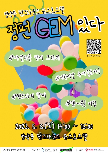 [금요저널] 남양주도시공사 정약용 펀그라운드에서는 어린이날을 맞이해 오는 5월 6일 청소년들에게 다양하고 유익한 체험활동 기회를 통해 건전한 여가생활과 더불어 개인의 발전과 성장을 도모하기 위한 ‘정펀 잼있다’를 운영한다.