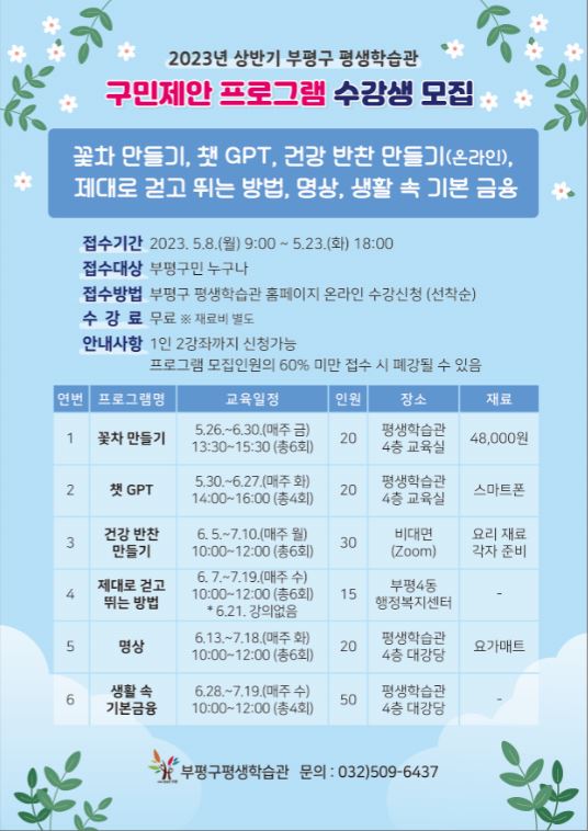 모집대상은 부평구에 주소나 사업장 소재지가 있는 사람이라면 누구나 참여할 수 있으며 수강료는 무료다.