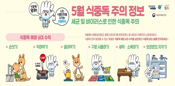 더해 식중독 예방 6대 수칙인 손씻기 익혀먹기끓여먹기 구분 사용하기세척·소독하기 보관온도 지키기 실천을 통해 식중독을 예방할 수 있다.