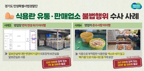 4일 경기도 민생특별사법경찰단에 따르면 지난 4월 3일부터 14일까지 도내 식용란 선별·포장업, 식용란수집판매업, 알 가공업체 360곳을 단속한 결과 32곳(33건)을 적발했다.