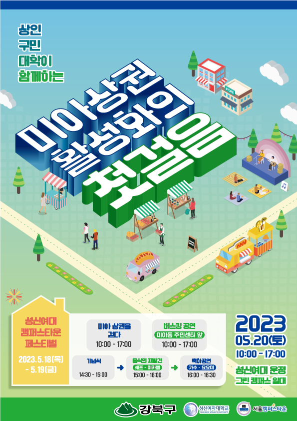 [금요저널] 서울 강북구는 지역상권 활성화를 위해 상인·구민·성신여대와 함께하는 ‘미아상권활성화의 첫걸음’을 오는 20일 성신여대 운정그린 캠퍼스 일대에서 개최한다고 밝혔다.