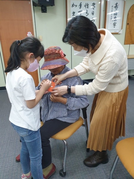 또한, 직접 만든 카네이션을 화동들이 고이 달아드리고 마을추진단에서 마련한 홍삼 제품과 파리바게뜨 부평갈산점에서 후원받은 효도 케이크를 같이 선물했다.