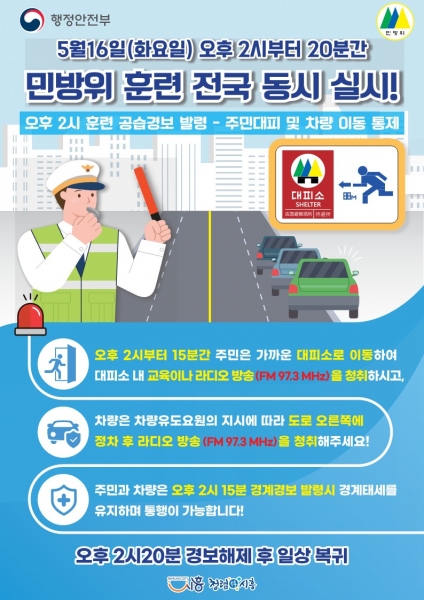 시흥시, 5월 16일 오후 2시 전국 민방위 대피 및 차량통제 훈련 실시