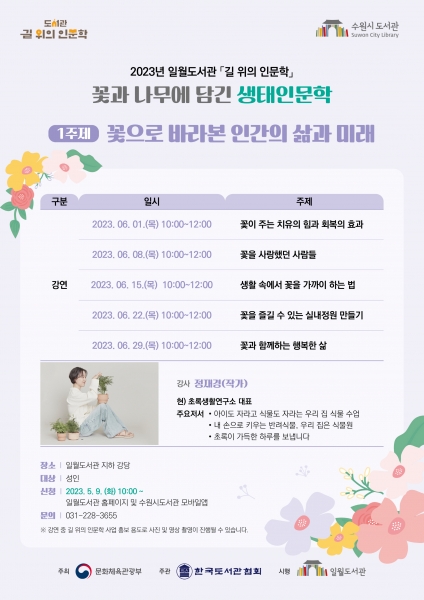 [금요저널] 수원시 일월도서관이 ‘2023년 길 위의 인문학 1주제-꽃으로 바라본 인간의 삶과 미래’ 참여자를 9일 오전 10시부터 선착순으로 모집한다.