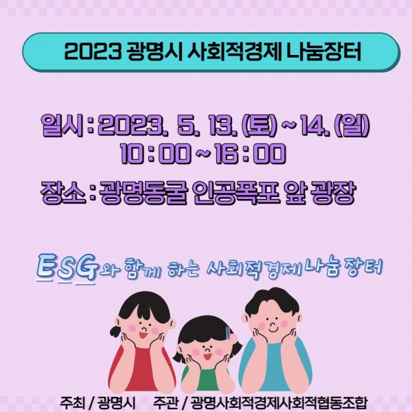 [금요저널] 광명시는 오는 5월 13일과 14일 이틀간 오전 10시부터 오후 4시까지 광명동굴 인공폭포 앞 광장에서 사회적경제 기업의 판로를 지원하고 ESG와 사회적 가치에 대한 시민 인식을 높이기 위해 사회적경제 나눔장터를 운영한다.