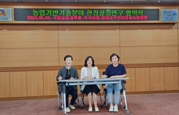 [금요저널] 안성시농업기술센터는 농촌진흥청 국립농업과학원, 안성시 보개면에 위치한 안성엄마손영농조합법인, 농업회사법인 주주바팜와 농산물 업사이클링 현장 실증을 위한 연구 협약을 5월 3일 체결했다.