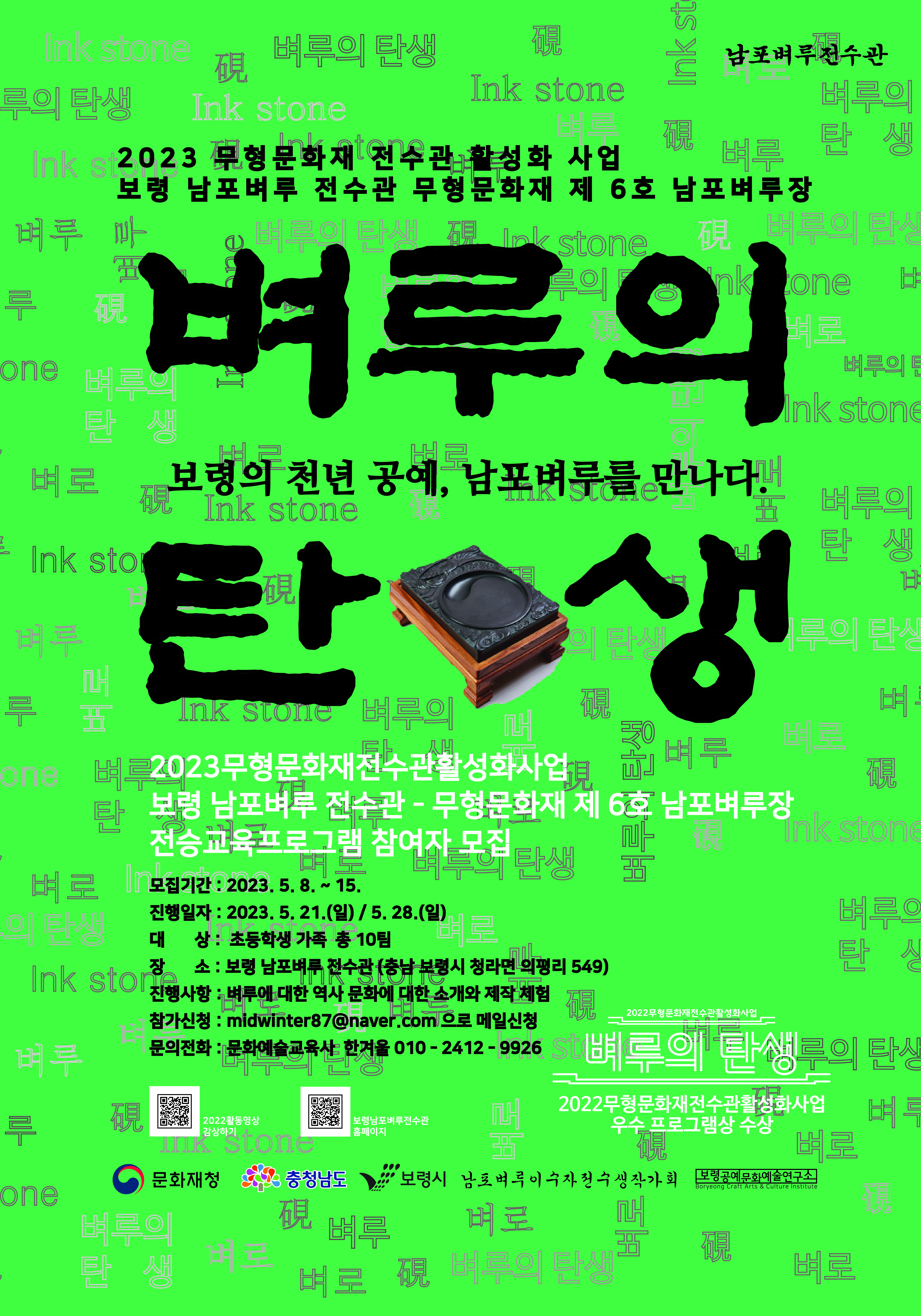 보령시는 오는 15일까지 2023년 무형문화재 전수교육관 활성화사업 ‘벼루의 탄생’ 프로그램 참여자를 모집한다.