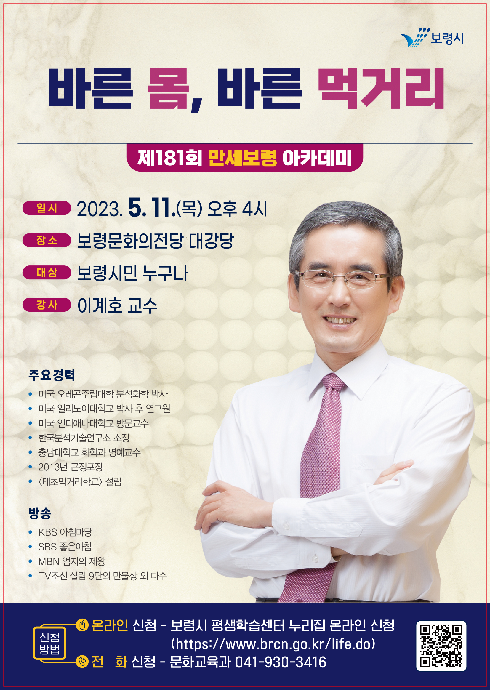 보령시는 오는 11일 오후 4시 보령문화의전당 대강당에서 이계호 교수를 초빙해 ‘바른 몸, 바른 먹거리’라는 주제로 제181회 만세보령 아카데미 강연을 개최한다.