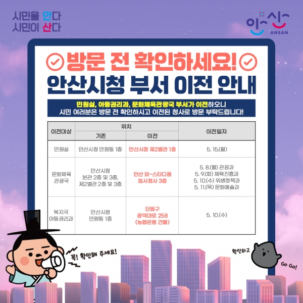 현재 민원동 1층에 위치한 민원실은 오는 15일부터 청사 내 제2별관 1층으로 이전해 업무를 개시하며 문화체육관광국은 안산 와~스타디움 임시청사 3층으로 아동권리과는 단원구 광덕대로 258에 소재한 농협 건물로 이전한다.