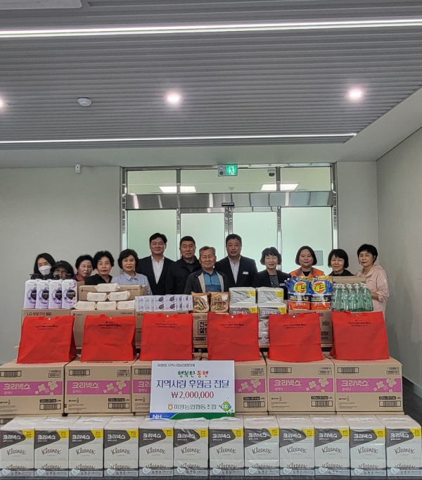 김관섭 미양농협 조합장은 “생필품 꾸러미로 5월 어버이날을 맞이해 더욱 따뜻한 날이 될 수 있었으면 하고 앞으로도 소외되는 이웃 없이 모두가 행복한 미양면을 만드는데 협력해 나가겠다”고 말했다.