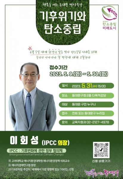 [금요저널] 동대문구가 오는 31일 이회성 IPCC 의장을 초청해 ‘기후위기와 탄소중립’을 주제로 특강을 진행한다.