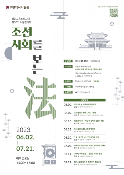 이번 박물관대학은 오는 6월 2일부터 7월 21일까지 8주간 금요일 오후 2시부터 4시까지 부평역사박물관 지하 다목적실에서 ‘조선사회를 보는 法’을 주제로 강연을 진행한다.
