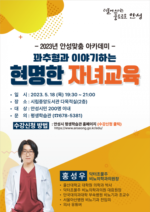 [금요저널] 안성시는 오는 5월 18일 저녁 7시 30분 시립중앙도서관 다목적실에서 안성맞춤아카데미 3회차 강연으로 꽈추형으로 잘 알려진 홍성우 조물주비뇨의학과원장을 초청해 ‘꽈추형과 이야기하는 현명한 자녀 성교육’이라는 주제로 강연을 펼칠 예정이다.