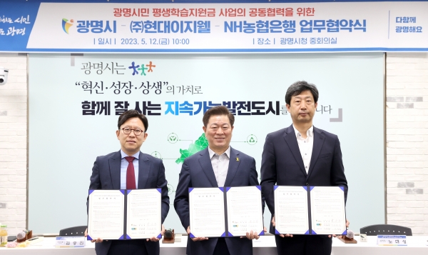 협약에 따라 광명시는 평생학습지원금 예산지원 및 총괄관리를 맡고 ㈜현대이지웰은 신청·사용 플랫폼 제공, 제휴업체 및 포인트 관리를, NH농협은행은 카드 발급과 지원금 정산을 각각 담당한다.
