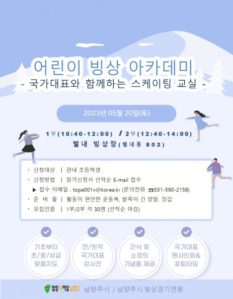 1기 아카데미는 오는 20일 별내빙상장에서 오전과 오후로 나뉘어 관내 초등학생 30명씩 총 60명을 대상으로 80분간 진행되며 어린이가 빙상에 쉽게 입문할 수 있도록 국가 대표 피겨 스케이팅 공연과 팬 사인회 등 다채로운 프로그램이 함께 운영된다.
