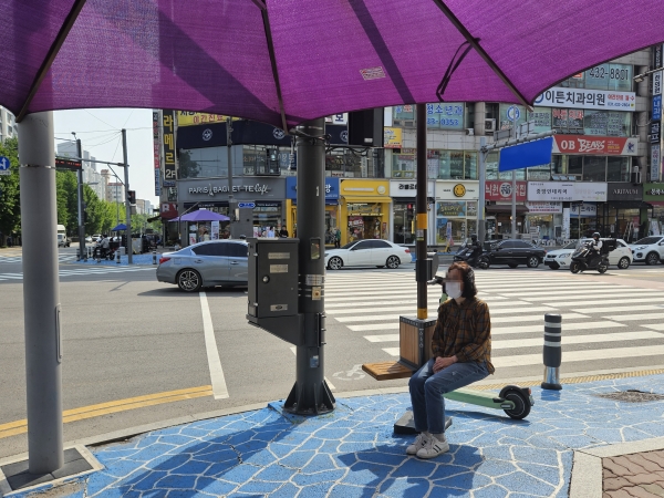[금요저널] 정왕4동 행정복지센터는 지난 15일 정왕4동 함송상가 사거리 그늘막에 쉼표의자를 설치해 보행이 불편한 시민들을 위한 쉼터를 제공하고 있다.