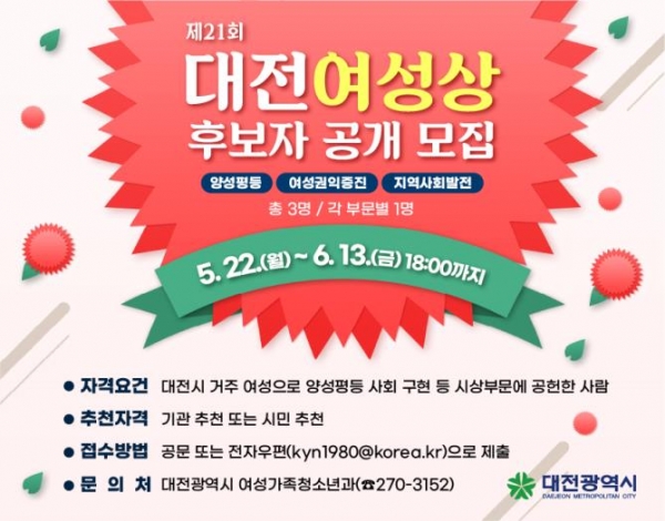 추천은 5월 22일부터 6월 13일까지 대전시 여성가족청소년과로 공문이나 전자우편으로 제출하면 된다.