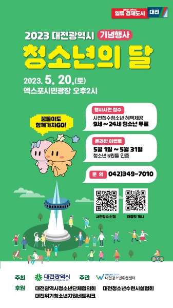[금요저널] 대전시가 주최하고 대전청소년위캔센터가 주관하는 2023년 청소년의 달 기념행사가 5월 20일 오후 2시에 대전엑스포시민광장에서 개최된다.