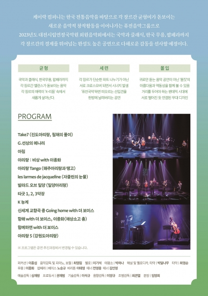 2023년도 회원음악회 “클래씨타 K로의 여정”에서는 국악과 클래식, 한국무용과 팝페라까지 각 장르 간의 경계를 뛰어넘는 완성도 높은 공연을 선보인다.