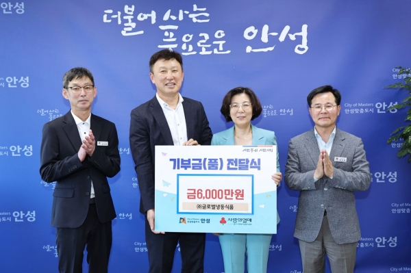 글로벌냉동식품은 올해부터 5년간 안성시에 매월 1백만원을 기부하고 안성시는 기부금을 경기도 사회복지공동모금회에 예치해 지역사회복지증진에 사용하기로 협약하고 전달식을 진행했다.