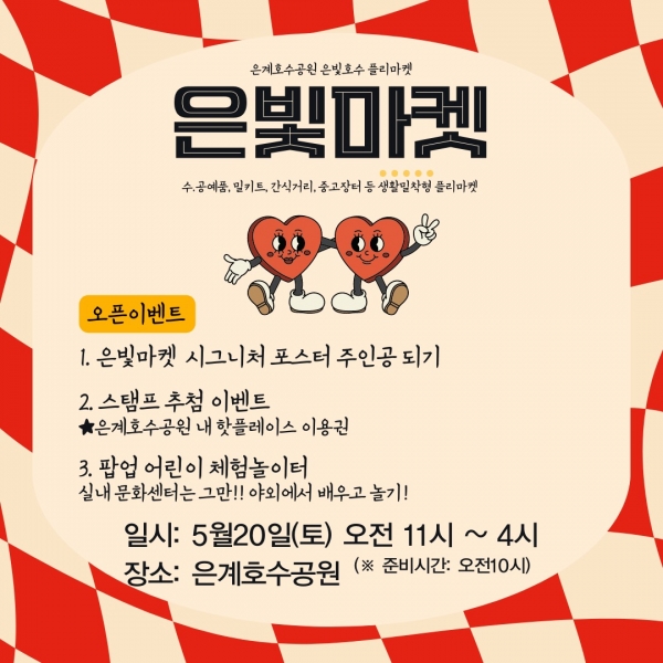 은빛마켓 프로그램은 은빛마켓 시그니처 포스터 주인공 되기 은계호수공원 내 핫 플레이스 이용권 제공을 위한 스탬프 추첨 이벤트 야외에서 놀고 배우는 팝업 어린이체험 놀이터 등으로 풍성하게 준비돼 있다.