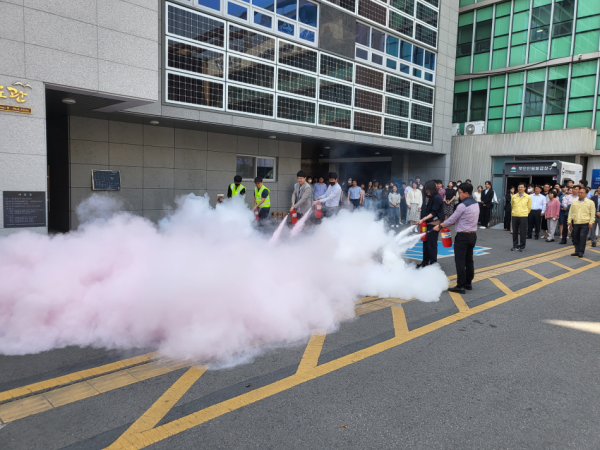 훈련은 화재 발생 신고 및 전파, 직원 대피 유도와 초기 화재 진압 순으로 실전과 다름없는 모의 화재진압 훈련으로 실시됐다.