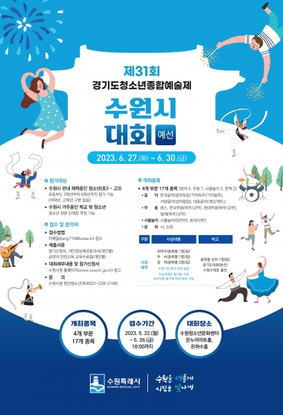 [금요저널] 수원시가 ‘제31회 경기도청소년종합예술제 수원시대회’에 참가할 청소년을 5월 26일까지 모집한다.