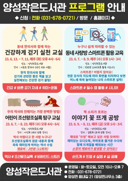 도서관 관계자는 “양성 작은도서관에서 준비한 문화 프로그램과 독서회에 많은 지역주민들이 참여해 본인도 몰랐던 재능과 취미를 발견하고 책 읽는 즐거움을 느낄 수 있는 기회가 되기를 바란다”고 말했다.