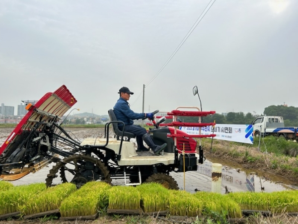 [금요저널] 시흥시는 경기도가 경기미 품질 향상과 농업인 영농 의욕 고취를 위해 추진한 ‘2023년 경기미 우수단지 농기계 공급사업’에 선정된 매화친환경2단지에 지난 22일 농기계 1대를 전달하고 모내기 시연 행사를 열었다.