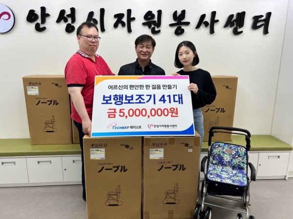 ㈜테키스트 김춘호 대표이사는 “어버이날을 기념해 후원 활동을 진행하고자 고민하던 중, 안성시자원봉사센터의 독거노인 보행보조기 지원 제안을 받고 이번 후원을 진행하게 됐다. 거동이 불편한 어르신들의 일상생활에 도움이 되었으면 좋겠다”며 훈훈한 마음을 전했다. 안성시자원봉사센터 김동성 센터장은 “여러 기업에서 가정의 달을 맞아 후원을 진행해 주셔서 매우 기쁜 마음이다. 곳곳에 산업단지가 조성된 안성 지역 특성에 맞게, 기업이 앞장서 지역사회 성장에 이바지해 주셔서 감사드린다”고 답변했다.