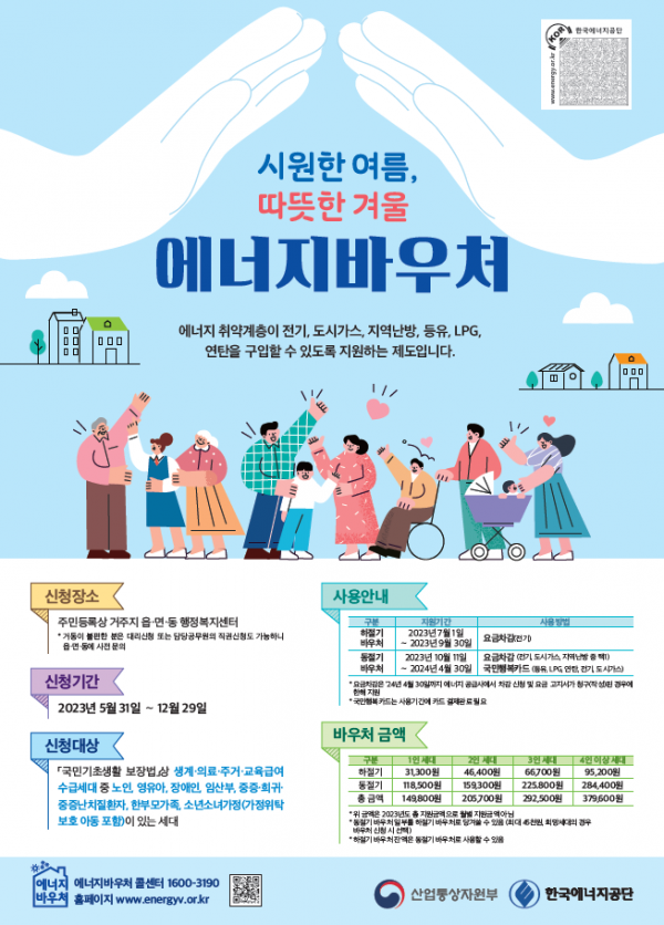[금요저널] 산업통상자원부는 5월 31일부터 12월 29일까지 전국 읍·면·동 행정복지센터 및 온라인 홈페이지에서 ’23년도 에너지바우처 사업의 신청·접수를 시작한다.