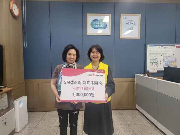 후원금 전달식에 참여한 정왕본동 행정복지센터 관계자는 후원해 주신 SM갤러리 김혜숙 대표에게 고마움을 전하며 “마련해 주신 후원금으로 관내 어려운 이웃주민의 복지문제를 해결할 수 있도록 좋은 방법을 강구해 나가겠다”고 밝혔다.