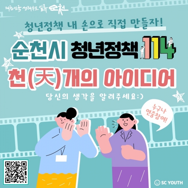 ‘천개의 아이디어’라는 이름에는 ‘순천 청년을 위한 정책 제안’과 ‘1,000개의 아이디어를 모은다’는 중의적인 의미를 담았으며 청년이 느끼는 불편함을 해소할 수 있는 간단한 아이디어부터 구체적인 해결방안을 제시하는 정책 제안까지 자유롭게 이야기할 수 있는 공간이다.