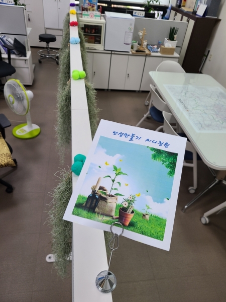 이 행사는 코로나19로 어느 때보다 힘들고 무거웠던 사무실 분위기 조성을 위한 일환으로 실내 미니 정원 만들며 직원들간의 소소한 일상에 찾아보기 힘든 힐링의 시간이었으며 매일 반복되는 생활속에서 식물과 접할수 있는 좋은 기회였으며 또한 아름다운 화분을 비치함으로써 사무실에 근무하는 직원들과 민원인분들도 함께 행복하길 바라는 마음으로 시행하고 있다.