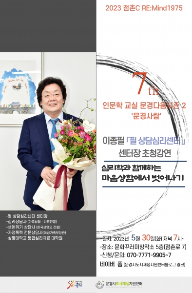 [금요저널] 문경시도시재생지원센터는 5월 30일 저녁 7시 문화꾸러미창작소 5층에서 이종필 필상담심리센터장을 모시고 ‘심리학과 함께하는 마음상함에서 벗어나기’라는 주제로 23년도 인문학교실 문경다움 시즌2, 1학기 마지막 초청강연을 진행한다.