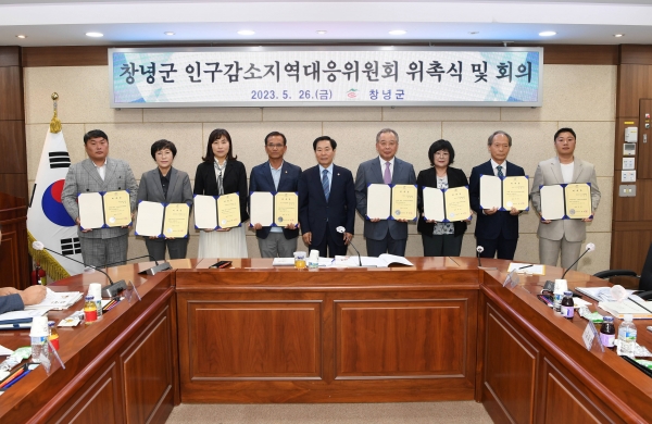 [금요저널] 창녕군은 26일 군정회의실에서 창녕군 인구감소지역대응위원회 위촉식 및 첫 회의를 개최했다.