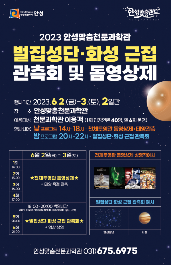 낮에는 ‘천체투영관 영상제’, 밤에는 ‘벌집성단과 화성의 근접 관측회’를 참여하고 싶은 관람객이라면 예매를 서두르자 자세한 사항은 안성맞춤천문과학관 홈페이지 공지사항을 참고.