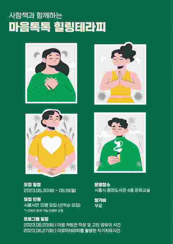 [금요저널] 시흥시 중앙도서관은 이달에 진행 예정인 ‘사람책과 함께하는 마음톡톡 힐링 테라피’ 프로그램 신청자를 5월 31일부터 모집한다.