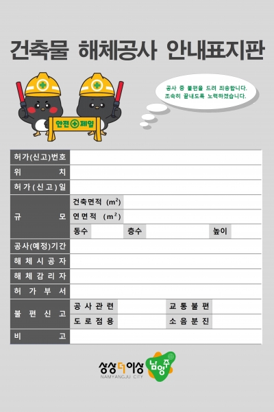 또한, 시에서는 안전사고를 예방하기 위해 안내 표지판 표준을 마련했으며 각 행정복지센터에서는 해체 허가 시 허가 이행사항에 안내 표지판을 설치하는 내용이 포함될 수 있도록 해체시공자에게 협조를 요청할 계획이라고 전했다.