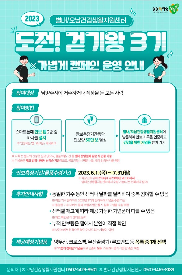 목표를 달성한 참여자는 전화 문의 후 별내·오남건강생활지원센터에 방문해 목표 달성을 인증할 수 있으며 선착순 200명에게는 소정의 기념품을 제공할 예정이다.