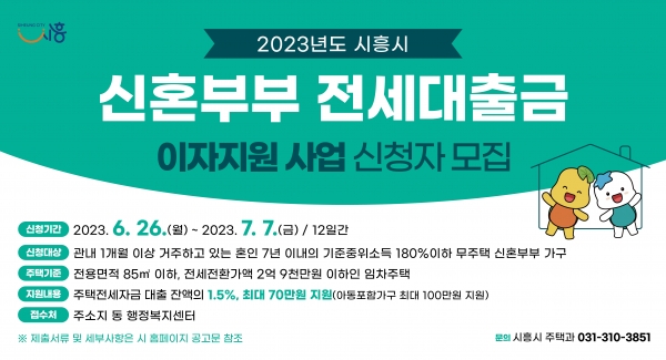 [금요저널] 시흥시는 1일부터 신혼부부 가구를 대상으로 하는 ‘2023 신혼부부 전세대출금 이자지원 사업’을 시행한다.