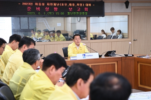 이재준 수원특례시장은 1일 시청 재난안전상황실에서 열린 ‘2023년 여름철 자연재난 대비 준비상황 보고회’를 주재하고 “자연재해 특별점검기간을 선포하고 현장점검반을 구성해 2주 동안 자연재해 위험이 있는 모든 곳을 세심하게 점검하라”고 말했다.