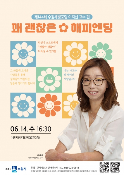 수원시는 6월 14일 오후 4시 30분 시청 대강당에서 ‘꽤 괜찮은 해피엔딩’을 주제로 ‘제144회 수원새빛포럼 이지선 교수 편’을 개최한다.