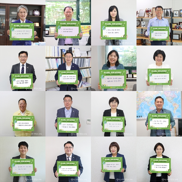 시흥시의회 의원 16명은 생활 속 작은 실천인 ‘종이타월 대신 손수건 사용하기’, ‘5층 이하 계단 이용하기’ 등 탄소중립 실천 약속을 적은 종이 팻말을 들고 사진을 찍어 자신의 누리소통망에 메시지와 함께 게시하는 방식으로 이번 캠페인에 참여했다.